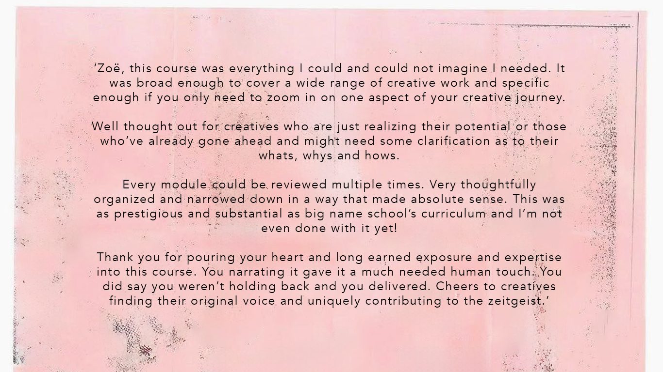 This course is built from that journey: from your questions, from my experiences, and from everything I wish I knew earlier. It’s for those who want to create work with real impact, and shape a creative life on their own terms.